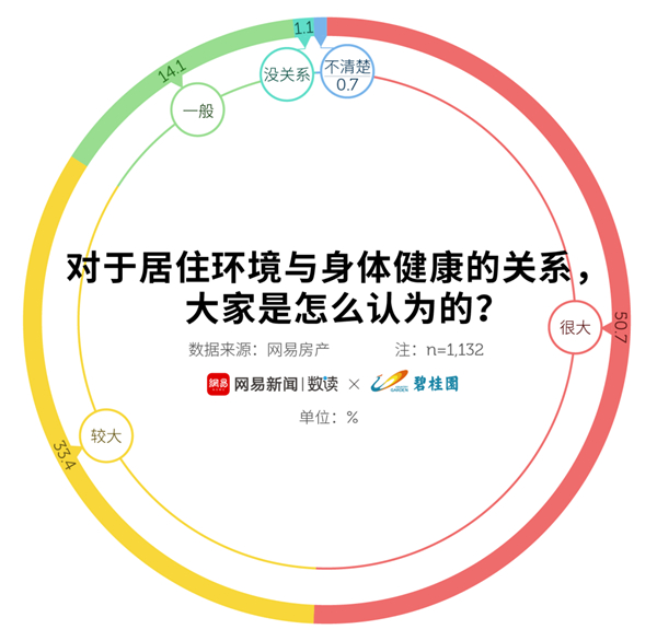 網易房產的調查數據顯示,在居住環境與身體健康的關系中,有50.7%的受訪者認為居住環境和身體健康的關系很大,33.4%認為關系較大,只有1.1%的人覺得沒有關系。